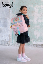 Stijlvolle en praktische schoolset BAAGL Zippy Regenboog in roze bevat een boekentas, etui en gymzak. Biedt ergonomische rugpadding, een verstelbaar rugsysteem voor perfecte afstelling, een lichte en stabiele constructie, reflecterende elementen voor veiligheid en een doordachte indeling voor alle schoolbenodigdheden.