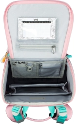 Het nieuwe klep-openingssysteem maakt toegang tot spullen direct vanaf de schoolbank mogelijk. Binnenin zit een transparant vak voor het rooster, een organizer met elastiek en een geïsoleerd voorvak met gesp.
