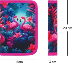 De tas wordt aangevuld met een eenlaags etui zonder inhoud en een stevige zak met karabijnhaak om aan de tas te bevestigen. Alles in een speels tropisch flamingomotief.