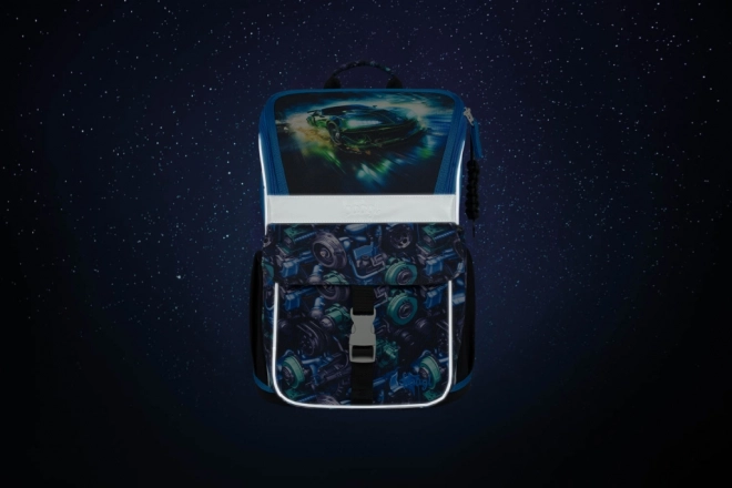 De praktische en stijlvolle set met racemotief maakt elke schooldag makkelijker. De ergonomisch gevormde schooltas met het verschuifbare rugsysteem ERGO ADJUSTABLE SYSTEM sluit precies aan op de lengte van het kind, terwijl de verstelbare schouder-, borst- en laterale compressieriemen zorgen voor comfort en een correcte verdeling van de belasting.