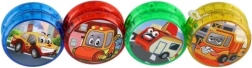 Het jojo is verkrijgbaar in meerdere kleurvarianten, waaronder blauw, rood, groen en geel, allemaal met vrolijke afbeeldingen van vervoersmiddelen.