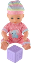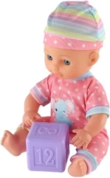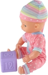 Deze charmante babypop met stevig lichaam is een geweldige speelkameraad voor elke dag. Dankzij het compacte formaat van 25 cm ligt hij goed in de hand en past hij gemakkelijk in kinderwagens en bedjes. De set bevat ook een speeldobbelsteen die het spel afwisselt en helpt bij het leren van cijfers en kleuren.