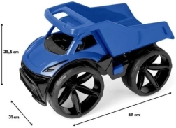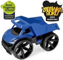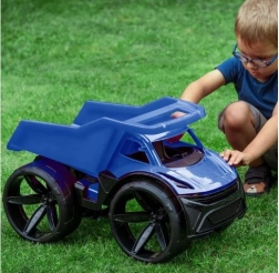 De kiepwagen MAXIMUS valt op door zijn futuristisch design, opvallende blauwe kleur en gedetailleerde afwerking. De brede bumper, schuin geplaatste verlichting en contrasterende oppervlakken geven het speelgoed een moderne uitstraling die de verbeelding van kinderen prikkelt.