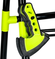 Duurzame constructie met groen‑zwarte koppelingen staat zelfstandig en houdt dankzij de houders de accessoires altijd binnen handbereik.