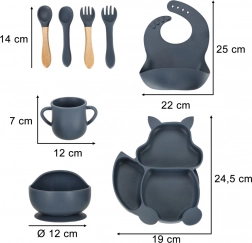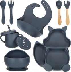 Complete 9-delige siliconen eetset voor kinderen met eekhoornmotief in donkerblauw. Bevat een verdeelbord, een kom met zuignap, een beker met twee deksels en een rietje, een slab en zacht bestek. BPA-vrij, stevig en eenvoudig te reinigen in de vaatwasser – ideaal voor de eerste zelfstandige eetmomenten met antislip-zuignappen.