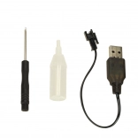 In de verpakking vind je een USB-oplaadkabel voor het gemakkelijk opladen van de accu, een schroevendraaier en een watertankje voor het stoom­effect. De controllers werken op standaard AA/AAA-batterijen (niet inbegrepen).