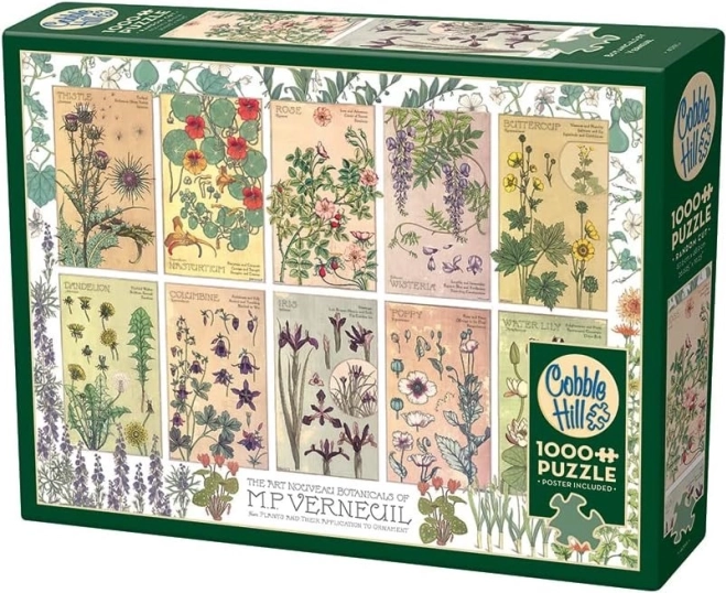 Uitdagendere puzzel van 1000 stukjes met botanisch motief van Verneuil. Niet-standaard COBBLE HILL-stans, ongewone stukvormen, voorbeeldposter inbegrepen. Afmeting 67,6×48,9 cm.
