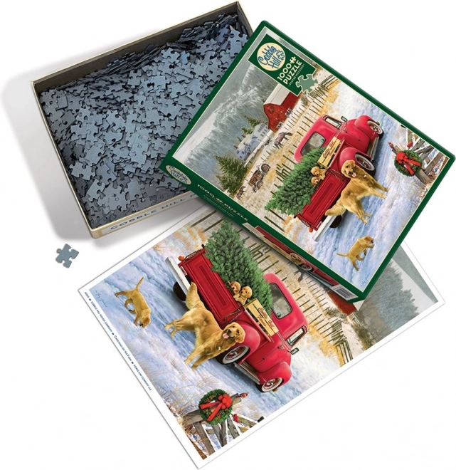 Puzzel 1000 stukjes Kerst op de boerderij van COBBLE HILL. Onconventionele stukvormen voor hogere moeilijkheid, hoge drukkwaliteit en voorbeeldposter inbegrepen. Afmeting 48,9 × 67,6 cm.