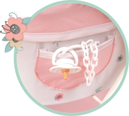 Praktische accessoires maken spelen makkelijker – de afneembare tas kan ook als heuptasje worden gedragen, het dekje voor de wieg is eenvoudig te bevestigen met lusjes en het zijvakje biedt ruimte voor kleine spulletjes. Eenvoudige bediening en preciese afwerking zorgen voor een lange levensduur en plezier bij elke wandeling met de pop.