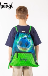 Praktische sportzak van Baagl voor schoenen en vrijetijdsactiviteiten met een motief van een voetbal. Biedt een stevig, afwasbaar materiaal, sluiting met koorden om op de rug te dragen, een karabijnhaak om aan de schooltas te bevestigen en een onderste ritszak voor kleine spulletjes.