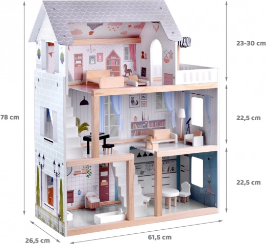 Dit houten poppenhuis is ontworpen om kinderen te inspireren tot creatief spel en verhalen vertellen. Het biedt een begane grond met keuken en badkamer, een eerste verdieping met woonkamer en leeshoek met muzieknis, en een zolder met een schattige kinderkamer en een groot terras. De subtiele boho-esthetiek, illustraties en houten details zorgen voor een kalmerende uitstraling.