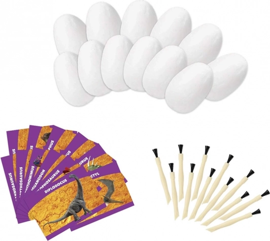 - 12 gipsen eieren, 12 dinosaurusfiguren (in de eieren), 12 kwastjes, opgraafgereedschap, 12 informatiekaarten (EN)