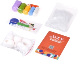 6× bolletje garen (ecru, blauw, geel, groen, paars, oranje); 5× rubberen ballon voor de vulling; vulling (watten); haaknaald 2,5 mm; veilige schaar; 2× veilige naald; zelfklevende oogjes; 10× veiligheidsspeld/markeerder; rolmeetlint; lijmsticks voor hetelijm; geïllustreerde handleiding (EN)