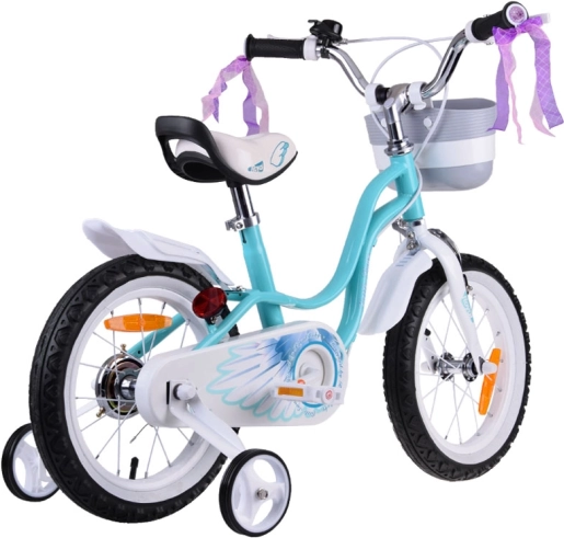 De lichte en veilige kinderfiets ROYALBABY Little Swan 14" in een elegante turkooizen kleur met glinsterend effect zal jonge fietssters blij maken. Biedt stabiliteit dankzij de zijwieltjes, efficiënte voor- en achterremmen, een comfortabel verstelbaar zadel met handgreep en schattige details zoals een mandje en linten aan het stuur voor plezier bij elke rit.
