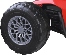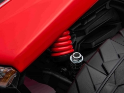 Twee 24V/200W motoren en terreinwielen trotseren oneffenheden en gras, terwijl vering voor en achter een comfortabele rit garandeert.