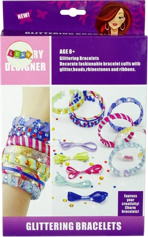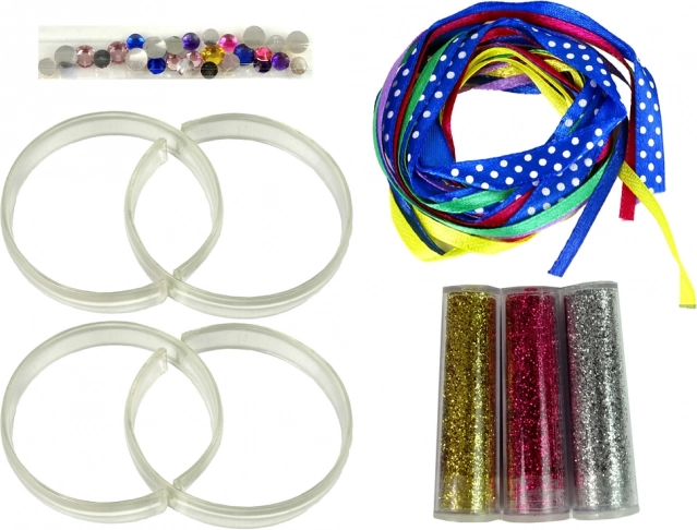 In de doos: 4 transparante armbanden, 3 glitters (goud, zilver, roze) en linten in diverse kleuren. De set zit in een decoratieve doos en is dus perfect als cadeau. Aanbevolen voor kinderen vanaf 8 jaar. Bevat kleine onderdelen.