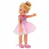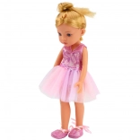 De pop heeft lang blond haar en een roze glinsterende jurk, wat haar een realistische balletlook geeft.