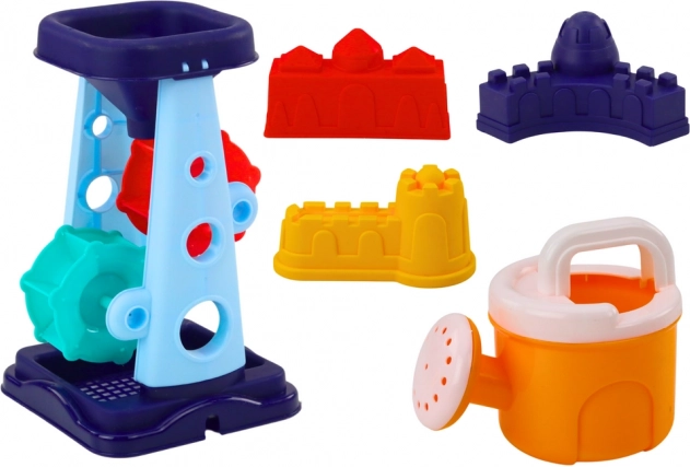 Set zandbak speelgoed met molen, schepjes en blauwe gieter