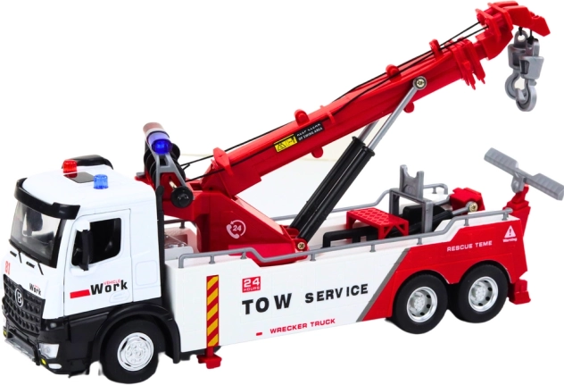De kraan is uitgerust met twee haken op lieren, die nauwkeurig kunnen worden neergelaten en opgehaald met draaiknoppen. De constructie met 360° rotatie geeft kinderen volledige controle over het verplaatsen van de lading. Knipperende lichten en realistische geluiden versterken de sfeer van reddings- of bouwacties.