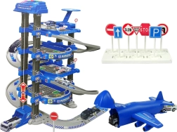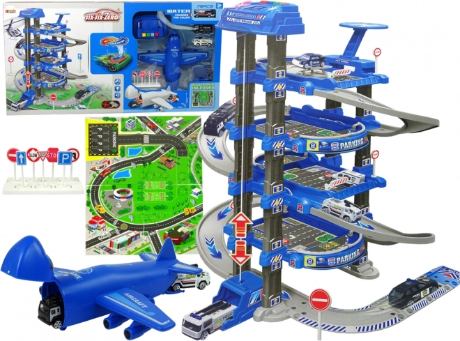 De set bestaat uit 79 onderdelen, wat een uitdaging is om zo'n parkeergarage te bouwen. Daarnaast bevat de set 3 politieauto's, een verkeersvliegtuig en een elektrische lift. Vier knoppen op de lift zorgen voor super melodieën en het op- en neer bewegen van de lift. Druk gewoon op de gele knop en de lift tilt de auto omhoog. Het vliegtuig heeft een openende voorkant en achterkant - hier kunnen politie vliegtuigen binnenkomen en snel soldaten naar de actie brengen.