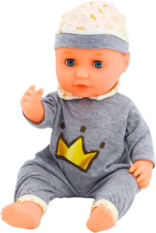 Interactieve pop in een schattige grijze pyjama met een gouden kroon is een ideaal speelgoed voor kinderen die graag voor hun poppen zorgen en volwassenen nadoen. Haar zachte pyjama en realistische functies maken het spel nog leuker.
