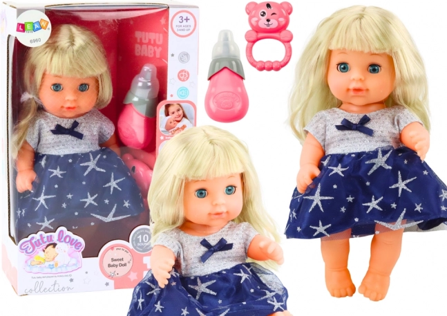 Elegante pop in matrozenjurk met lang blond haar biedt haarstyling met verschillende kapsels. De realistische ervaring wordt ondersteund door beweegbare ledematen en sluitende ogen die nabootsen hoe een baby zijn ogen sluit tijdens het slapen.