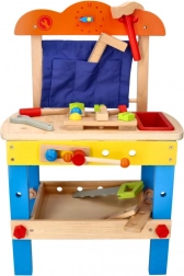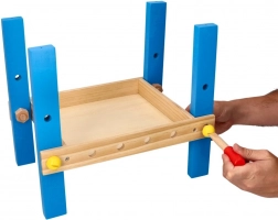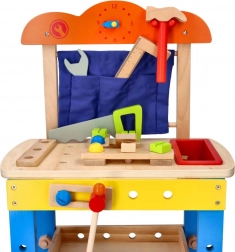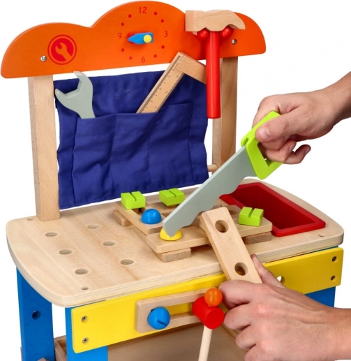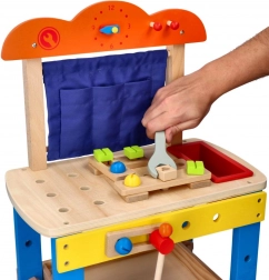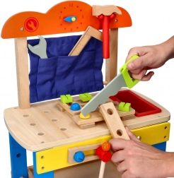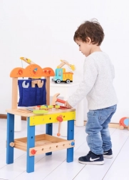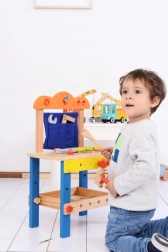 Dankzij de compacte afmetingen en een werkhoogte van 34 cm is de werkbank ideaal voor de kinderkamer. Gemaakt van hout en geleverd met een uitgebreide gereedschapsset die zelfstandigheid, geduld en logisch denken bevordert.