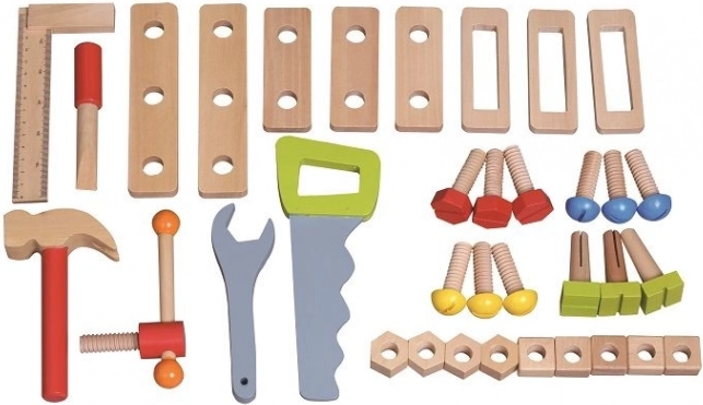 - Houten werkbank + gereedschapsset (hamer, zaag, schroevendraaier, steeksleutel, schroeven, moeren, tandwielen en andere onderdelen)