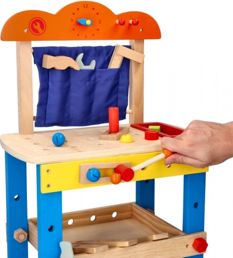 Een stevige werkplaat, textielen zakken en haakjes houden het gereedschap binnen handbereik. De werkhoogte van 34 cm is comfortabel voor jonge kinderen.