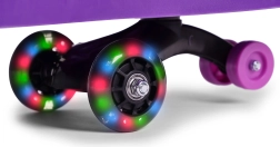 Rubberen wielen zorgen voor een soepele en stille rit en beschermen tegelijk de vloer tegen krassen, waardoor hij geschikt is voor binnen en buiten. LED-diodes in de wielen lichten op tijdens het rijden en verhogen de zichtbaarheid bij schemering, wat het plezier een veilige en spectaculaire dimensie geeft.
