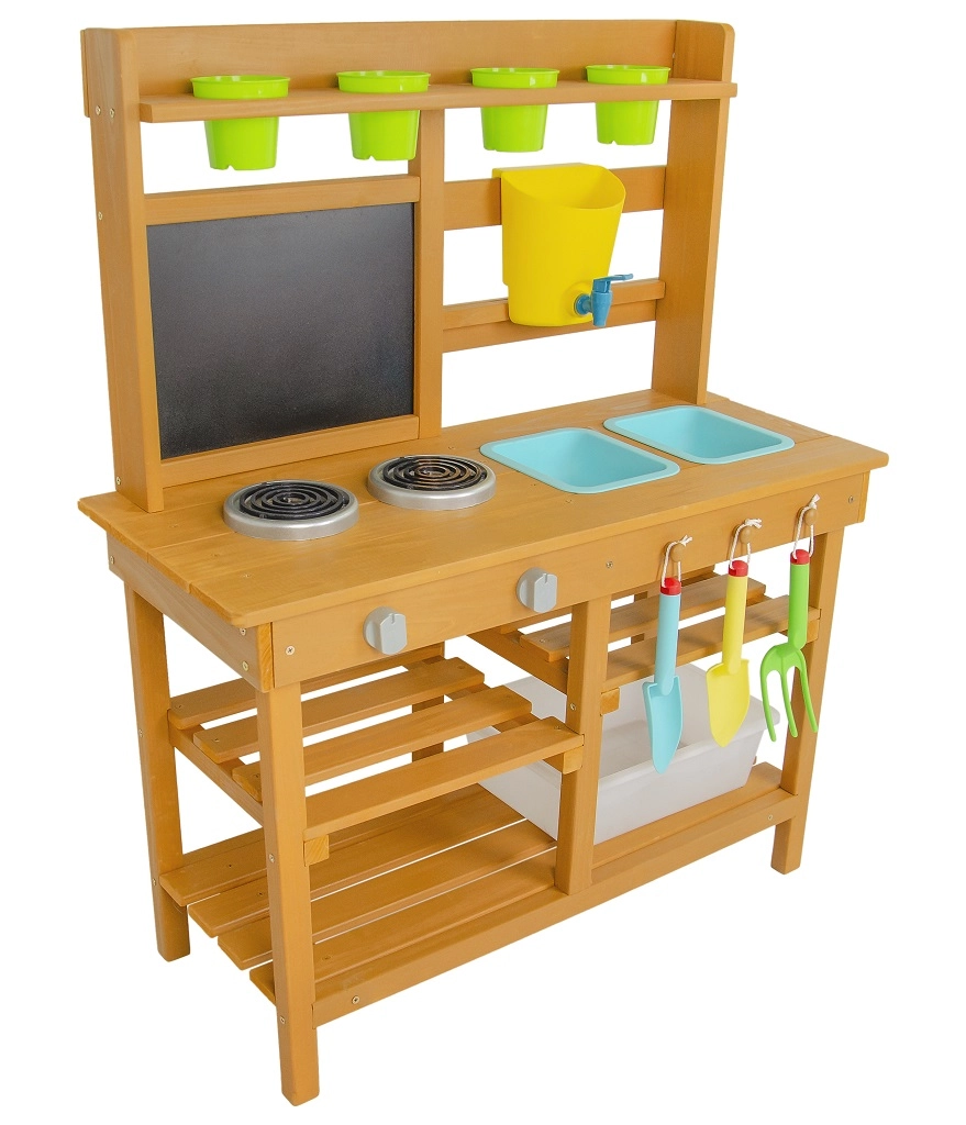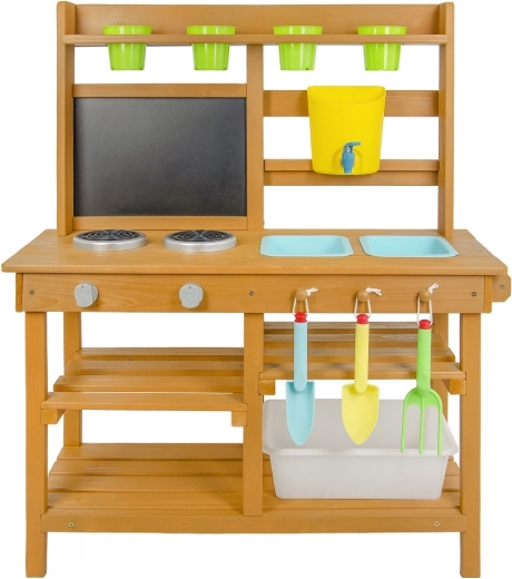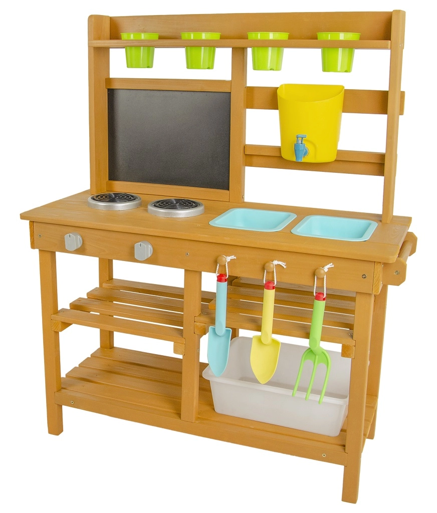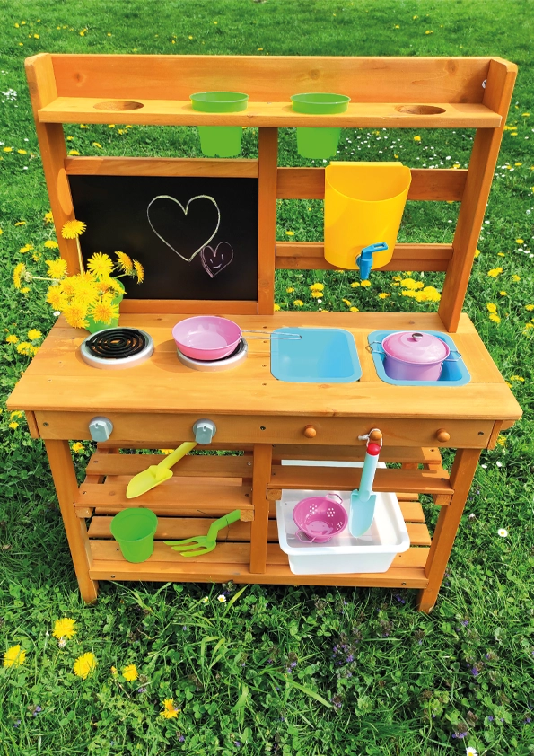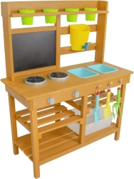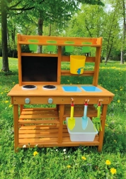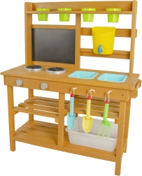Bied een tussendoortje aan direct onder de horizon van de natuur! Op een plek waar gerechten geuren naar frisse wind en de zon broodjes bakt van zand en water. Deze tuinkeuken biedt een geweldige mogelijkheid voor kinderen om hun creativiteit, zelfstandigheid en culinaire vaardigheden direct in de frisse lucht te ontwikkelen. Het beschikt over handige elementen zoals een kraan, fornuis, keukengerei (in de vorm van een schepje en een kleine hark) of emmers. Uitgebreide opbergruimtes zijn zeker ook handig. Wat staat er vandaag op het menu? Pure fantasie! Belangrijkste kenmerken: compacte afmetingen, accessoires inbegrepen, multifunctioneel, veelzijdig gebruik, ruime opbergruimte.