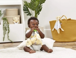 De getextureerde buik, zachte oortjes en stoffen lintjes aan de staart nodigen je baby uit om te voelen, te knijpen en de fijne motoriek te ontwikkelen.