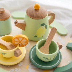 Een pastelpalet van groen en geel met charmante citrus- en bloemdetails prikkelt de verbeelding en maakt van de set een prachtige aanvulling op de kinderkitchen.