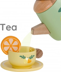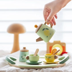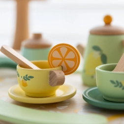 Geef kinderen een magisch theeritueel met een elegante houten set in zachte pasteltinten. De set is versierd met fruit- en bloemmotieven en bevat een theepot, kopjes met schoteltjes, lepeltjes, een melk- en suikerpot en een groot dienblad met handgrepen voor gemakkelijk dragen.