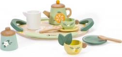 Theepot, kopjes, schoteltjes, lepeltjes, melk- en suikerpot en een ruim dienblad – alles op elkaar afgestemd in zachte pasteltinten voor eindeloze spelscenario’s.