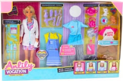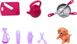 - Pop, meerdere outfits (jas, schort, vrijetijdskleding), schoeisel, thematische accessoires (bijv. stethoscoop, keukengerei, accessoires voor het huisdiertje)