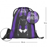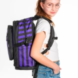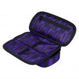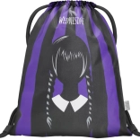 De Cubic Wednesday-set bevat een stijlvolle rugzak, een praktische etui en een gymsack voor schoenen, allemaal in een modern design met zwarte en paarse strepen. De rugzak is ontworpen om ergonomische behoeften te ondersteunen, terwijl de etui en de zak zorgen voor organisatie van schoolspullen en vrijetijdsactiviteiten.
