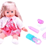 De set bevat praktische accessoires: een kommetje met pap, een lepeltje, een speen, een flesje en een rammelaar. Kinderen kunnen hun baby voeren, troosten en in slaap helpen.