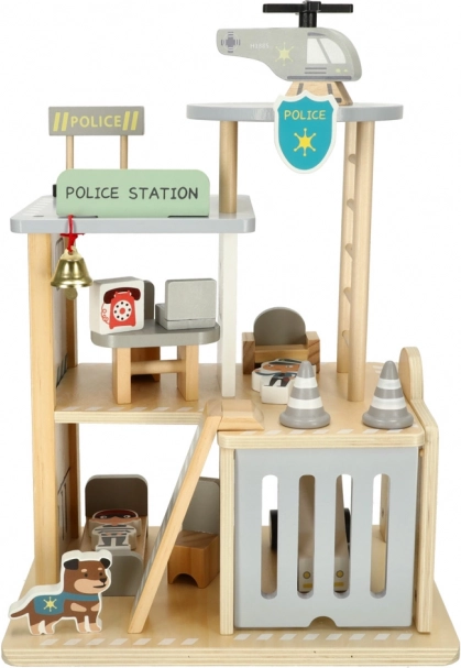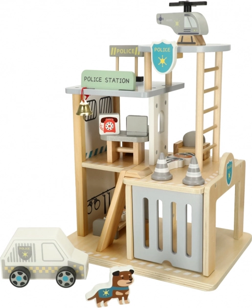 Deze doordachte houten set neemt kinderen mee in de wereld van reddingsacties. Op de begane grond is er een garage voor de politieauto en een cel voor de dief, in het midden een kantoor van de chef en op het dak een heliport voor snelle uitrukken. Het glad afgewerkte hout zorgt voor veilige hantering en een lange levensduur van het speelgoed.