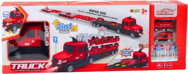 Ontdek 2-in-1 plezier – een grote rode autotransporter die bij uitklappen verandert in een racebaan van 211 cm. Inclusief licht- en geluidseffecten, 2 brandweeraauto’s 1:64 en 7 verkeersborden voor creatief spel en het leren van verkeersregels.