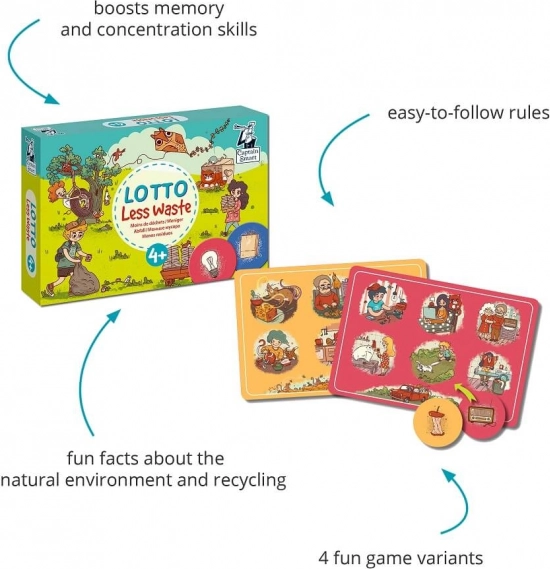 Geef afval een nieuw leven en leer kinderen wat thuishoort bij plastic, papier, glas, gft-afval en e-waste. Het spel Captain Smart loto – schone planeet is eenvoudig en leuk voor 1–6 spelers vanaf 4 jaar, met schattige illustraties en vier moeilijkheidsvarianten. De opdracht is om fiches aan de juiste plekken op de speelborden te koppelen, waarbij je over de afbeeldingen kunt praten en zo op natuurlijke wijze de woordenschat ontwikkelt.