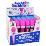 Het transparante flesje met heldere vloeistof heeft een praktische, langwerpige vorm voor makkelijk vasthouden. Trek het stokje eruit, blaas zachtjes of zwaai en er ontstaan meteen prachtige, regenboogkleurige bellen. Ideaal voor feestjes, speeltuinen en gezellige familiemomenten.