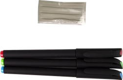 De set bevat 3 gekleurde stiften en klei die de sjablonen op het papier fixeert. Dit voorkomt verschuiven en garandeert strakke lijnen zonder vegen.