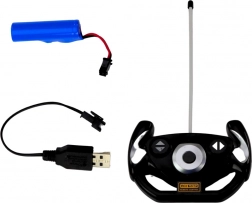 Afstandsbediening in de vorm van een stuur met knoppen en een metalen antenne voor betere bestuurbaarheid van het speelgoed.