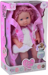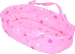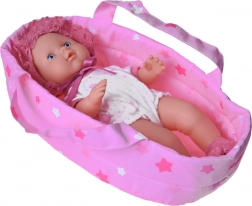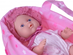 Schattige babypop in een stoffen draagtas voor realistisch rollenspel als ouder. Na drinken uit het flesje drinkt en plast de pop, heeft blauwe ogen, zachte kleertjes met een konijntjesmotief en wordt geleverd met een praktische draagtas/draagmand met een stijlvolle sterrenprint. Perfect ter stimulatie van de fantasie en zorgvaardigheden van kinderen.
