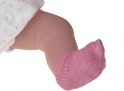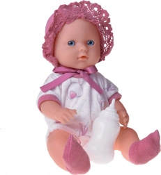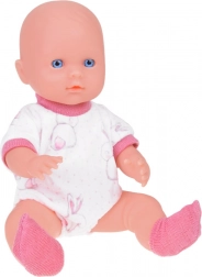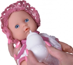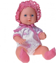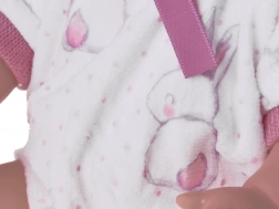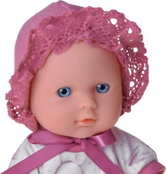 De pop heeft charmante blauwe ogen, een roze mutsje, een wit‑roze outfit met een schattig konijntjesmotief en roze schoentjes/sokjes. Armen en benen zijn beweeglijk, het lichaam is van duurzaam kunststof met een aangename afwerking, wat zorgt voor eenvoudig onderhoud en een lange levensduur.