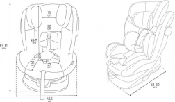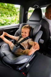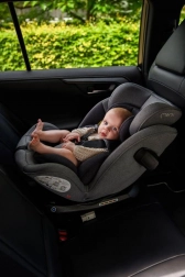 Een unieke functionaliteit van het autostoeltje is de draaibare basis, die eenvoudig instellen zowel tegen als met de rijrichting mogelijk maakt. De stoel is uitgerust met een ISOFIX systeem met indicator voor correcte montage en een Tether band voor nog meer veiligheid.