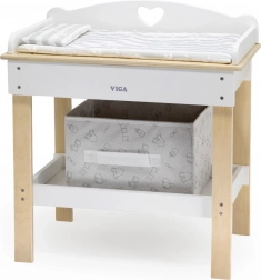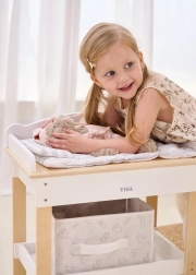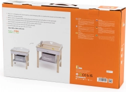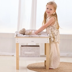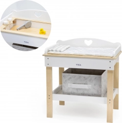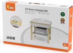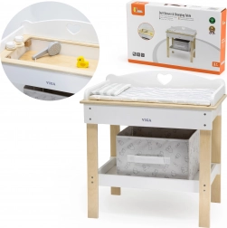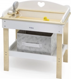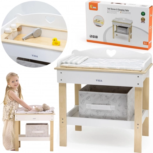 Deze multifunctionele set van VIGA laat kinderen realistisch voor een baby zorgen. Het bovenblad dient als een comfortabele verschoontafel; na het verwijderen verandert het in een badje met douchekop voor waterpret met poppen. De onderste plank met een textielen mand houdt alle accessoires netjes binnen handbereik.