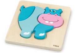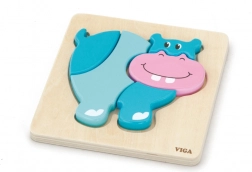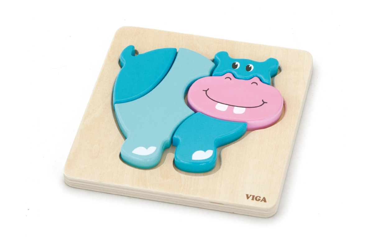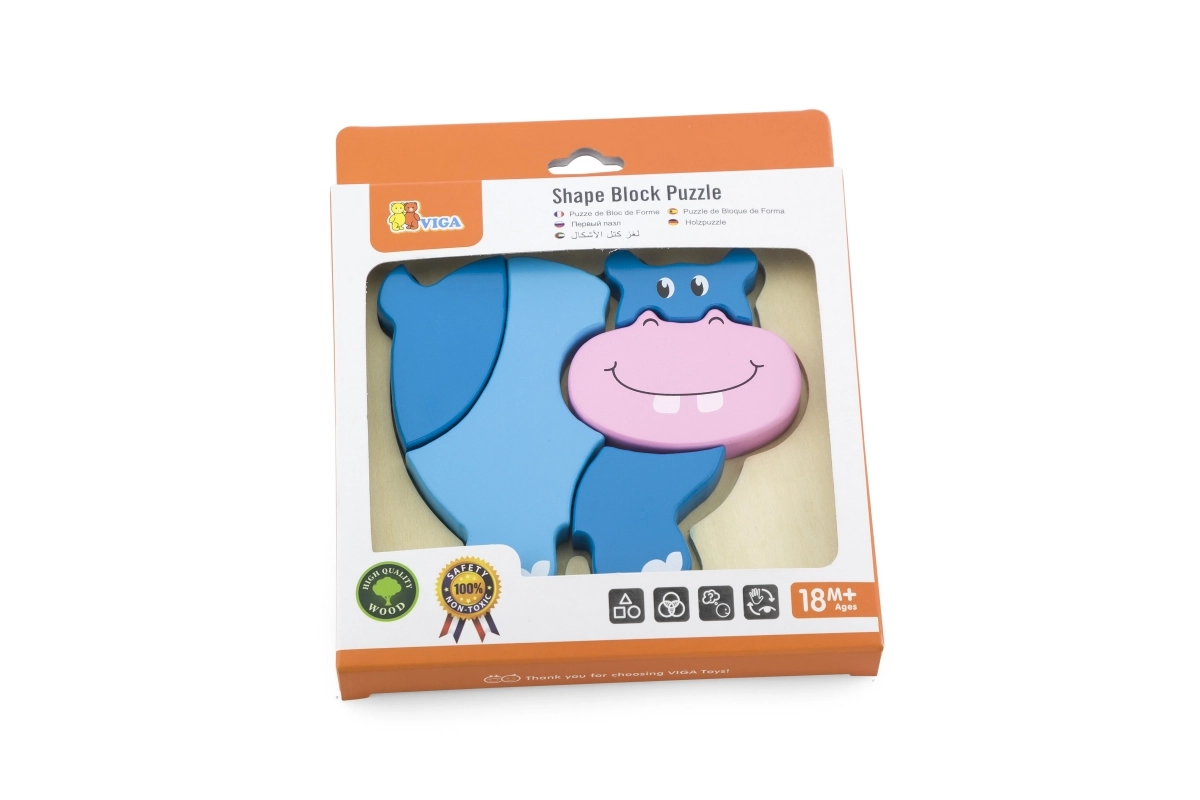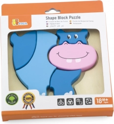 Houten puzzel – inlegpuzzel voor de allerkleinsten met nijlpaardmotief. Afmetingen nijlpaard ca. 13 x 11 cm. Afmetingen verpakking ca. 15,5 x 18 x 2 cm. Leeftijd 18 m+.