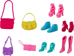 De set bevat een collectie modeaccessoires, waaronder schoenen en handtassen in levendige kleuren zoals roze, geel, turkoois en paars.